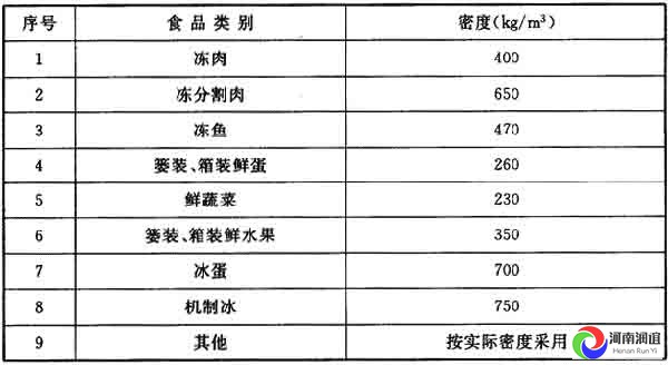 注:同一冷庫(kù)如同時(shí)存放豬、牛、羊肉(包括禽兔)時(shí),密度可按400kg/m3確定;當(dāng)只存凍羊腔時(shí),密度應(yīng)按250kg/m3確定;只存凍牛、羊肉時(shí),密度應(yīng)按330kg/m3確定。
